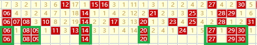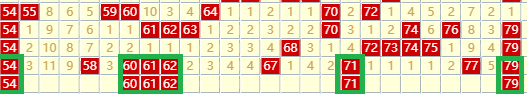 如上图重码选号为:06 08 09 14 20 27 29 30 54 60 61 62 71 79共14个号码