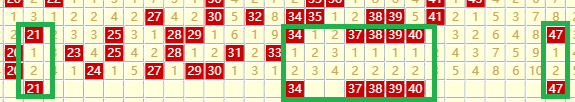 如上图遗漏2期选号 为:21 34 37 38 39 40 47 63 70 76共10个号码