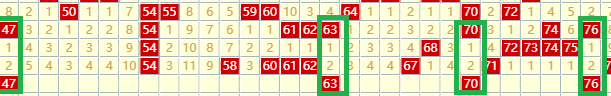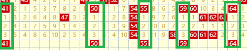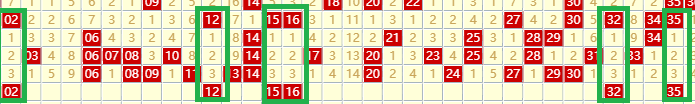 如上图 遗漏3期选号为:02 12 15 16 32 35 41 50 55 59 64共11个号码