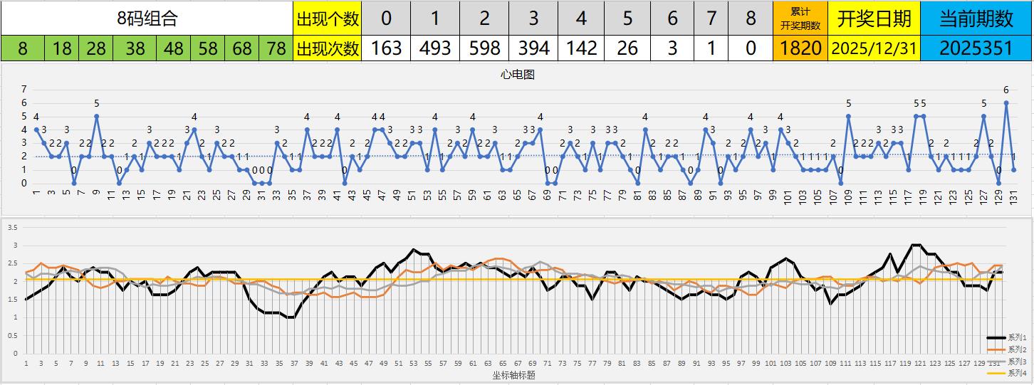 8尾组合历史上8码全开没发生过,最多只有一次开7码。而开6码也很少,只有3次,最近一次是上上期(第2025349期),所以现在算是站在风口上,热开效应很明显。最近一个月不仅开了一次6码,还有4次5码,而历史上开5码也仅有26次,可见8尾号码组合有多热。基于惯性运动原理,当号码组合持续热开期间,可以相信这种热开趋势会顺势延续一段时间,这就是所谓的强者恒强理论。
