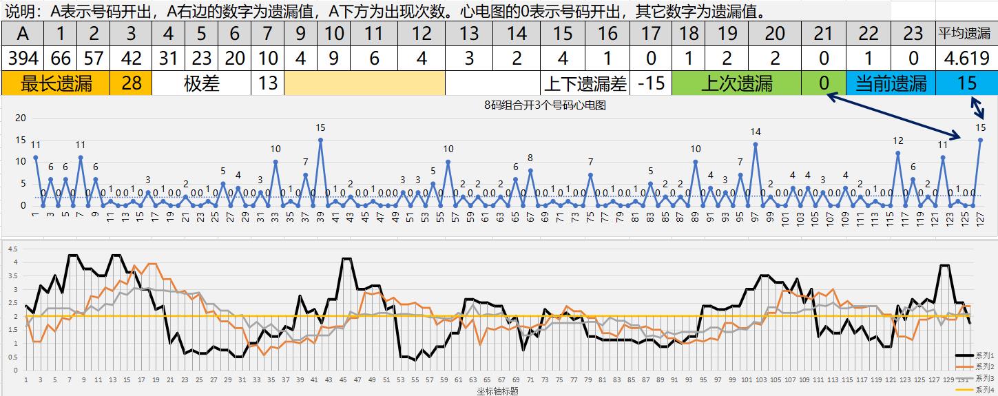 当前遗漏15,表示已经有15期未开3个号码了,而从图形上看,在最近很长一段时间,开3码的最长遗漏记录是15,当前遗漏值平了近期遗漏纪录,已经是憋了很久,呼之欲出。另外,8码开3码的历史最长遗漏纪录是28期,当前遗漏15,距离历史极值是13期。