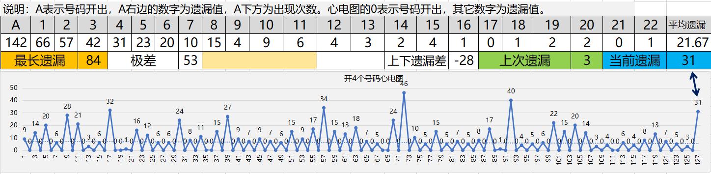 当前遗漏31,表示已经有31期未开4个号码了。历史遗漏极值纪录是84,当前遗漏31,距离极值还有53期,也远低于近期高点40和46。在前2轮(14-13)周期,期间开了5次,遗漏值(3-4-6-4-8),上一轮(13-至今)也开了3次(7-5-3),开出次数算多了,也可能是物极必反,短期内多开造成了如今的一路冷开。但还是可以期待一下的,因为冬天来了,春天还会远吗?