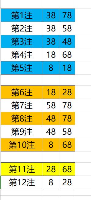 如果有时候不好确定单码,号码不好选,也可以尝试把一组号码当作一个整体来研究,只要这组号码能开其中几个号码就可以了。投注策略依然是采用矩阵打法,8码可以选择选2,中3保2,矩阵组合是12注,如下: