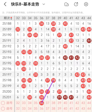36码,如上图所示,与往期奖号37 38码形成一个隔1的斜3连,所以看好。