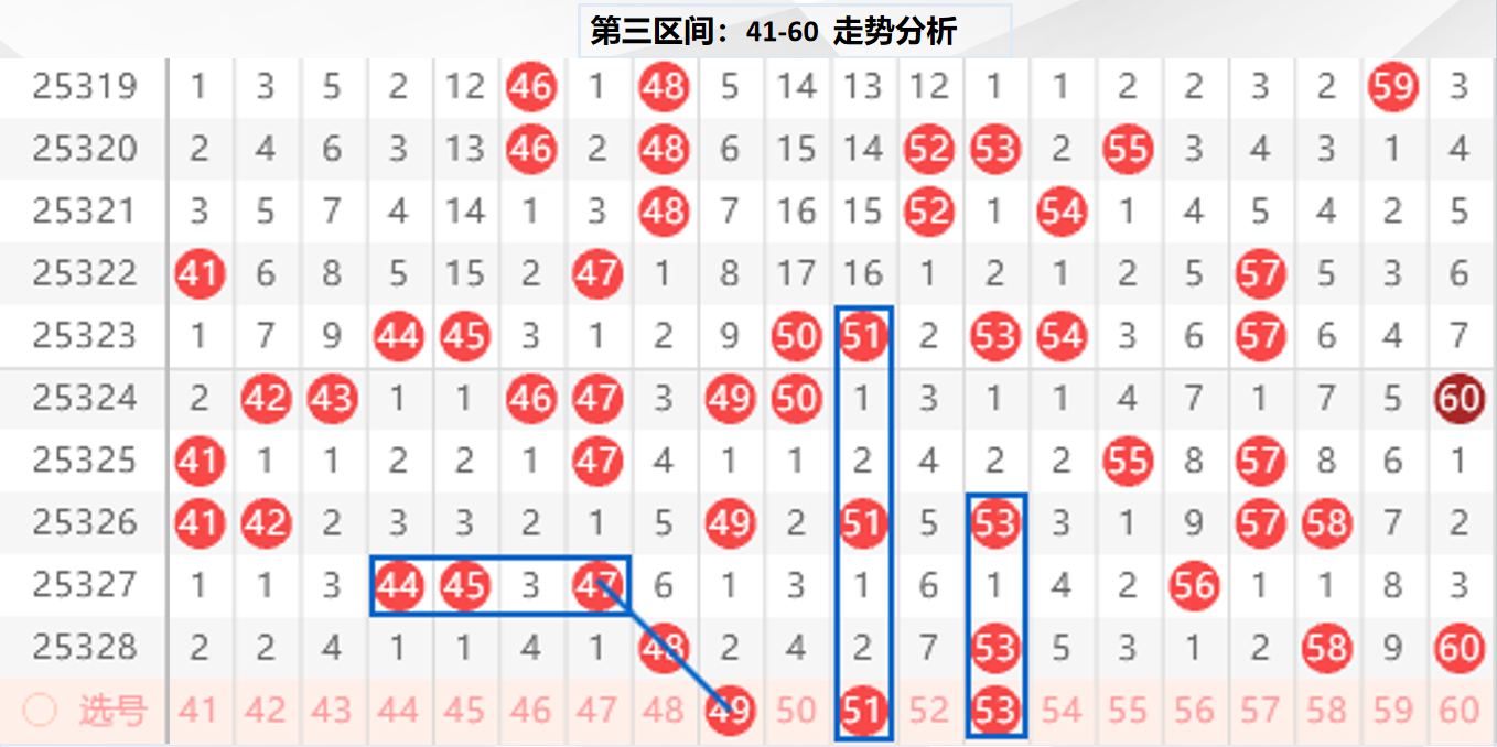 三区分析:【41-60】(走势图标注号码非小黄车大底,请谨慎参考,具体思路将在直播间分享讨论)