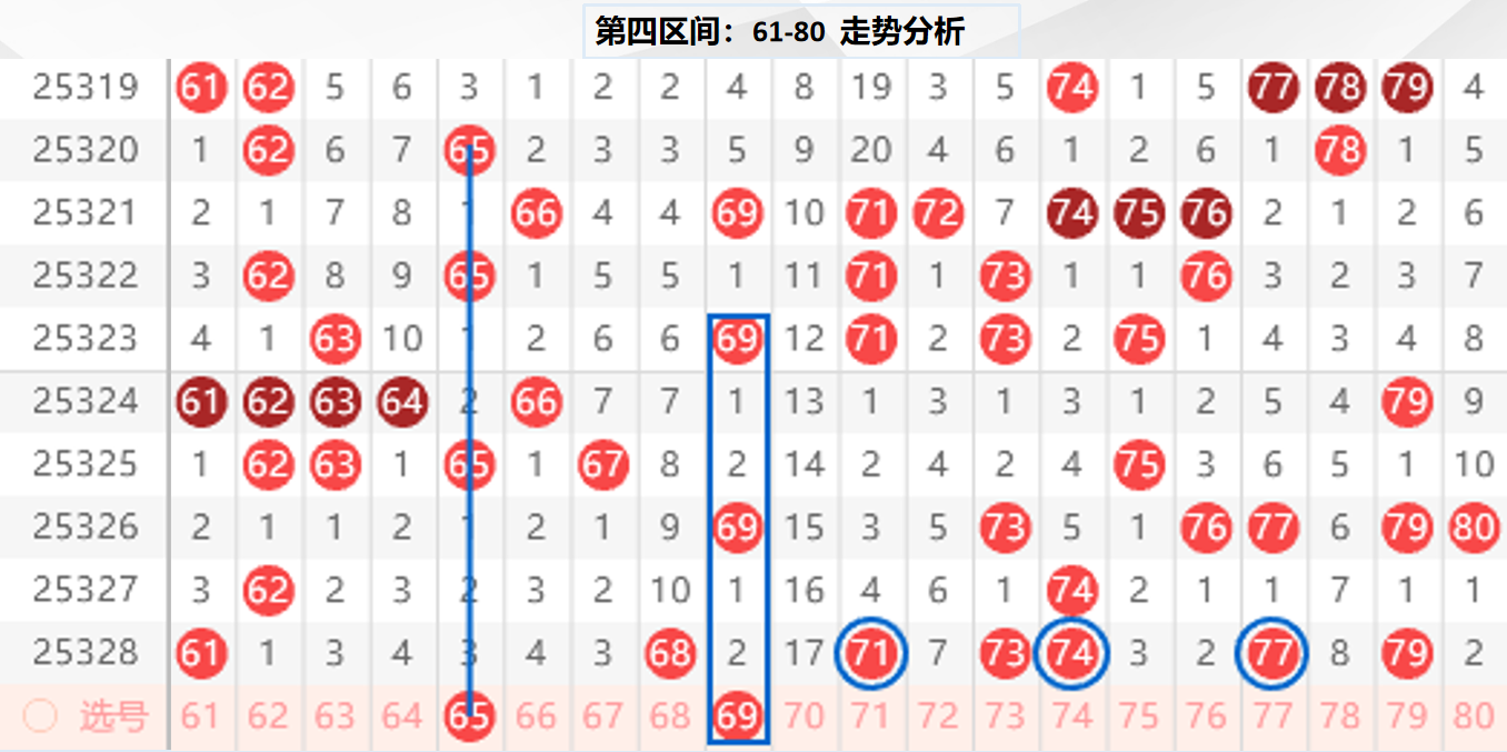 四区分析:【61-80】(走势图标注号码非小黄车大底,请谨慎参考,具体思路将在直播间分享讨论)