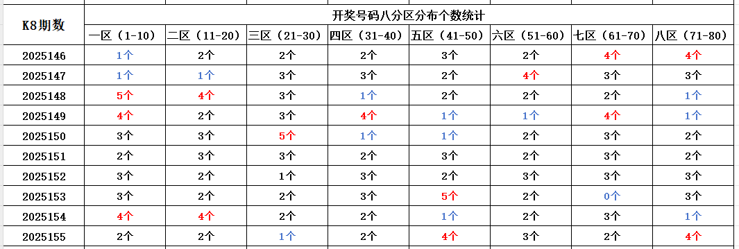 如图,红色字体是热号区,区间开出4个及以上号码。蓝色字体是冷号区,区间开出1个及以下号码。以近10期为一个分析周期,依据久热必冷,久冷必热的规律,本期重点关注:一区、五区、八区,区间可能开出3-4个号码。三区、七区,区间可能开出1-2个号码。个人分析,仅供参考。