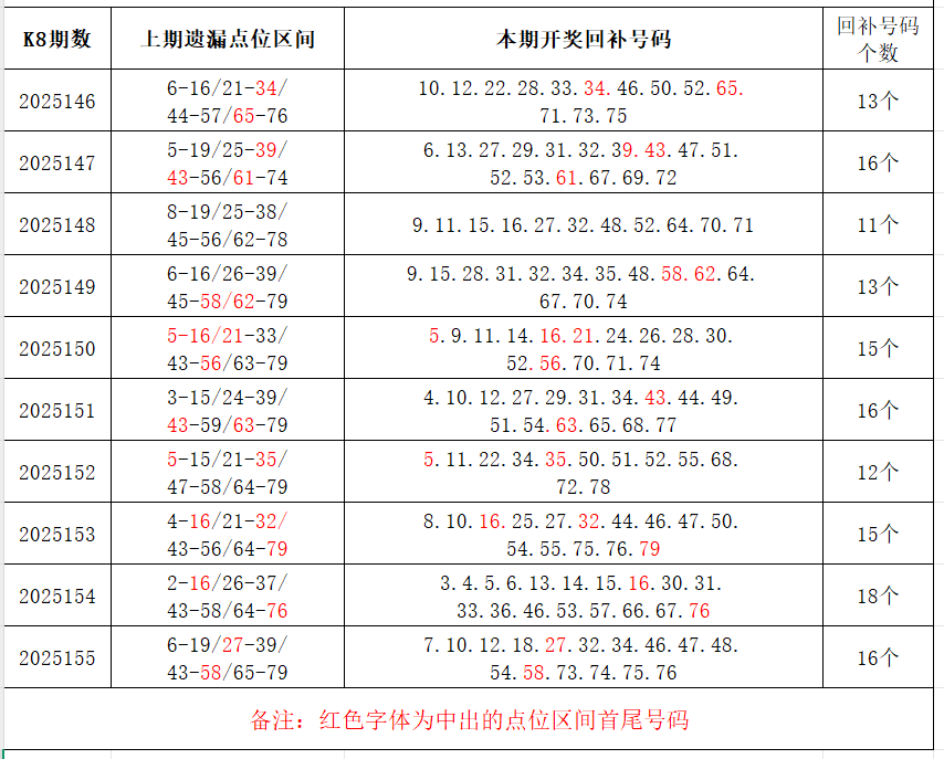 如图,上期的遗漏号码在下期开出10个左右,即为回补号码。定准点位区间首尾号码是关键!以上期2025155期(会员专区数据)为例,定位4个遗漏区间,围中16码!结合上期开奖号码,以跨度值大于或等于7为依据,本期关注4个遗漏区间:1-7/18-27/34-42/63-73;重点关注遗漏-区间:****(会员专区可见),区间遗漏号码可能在本期回补开出。注意区分遗漏区间回补号码和大底号码,不要混淆。个人分析,仅供参考。