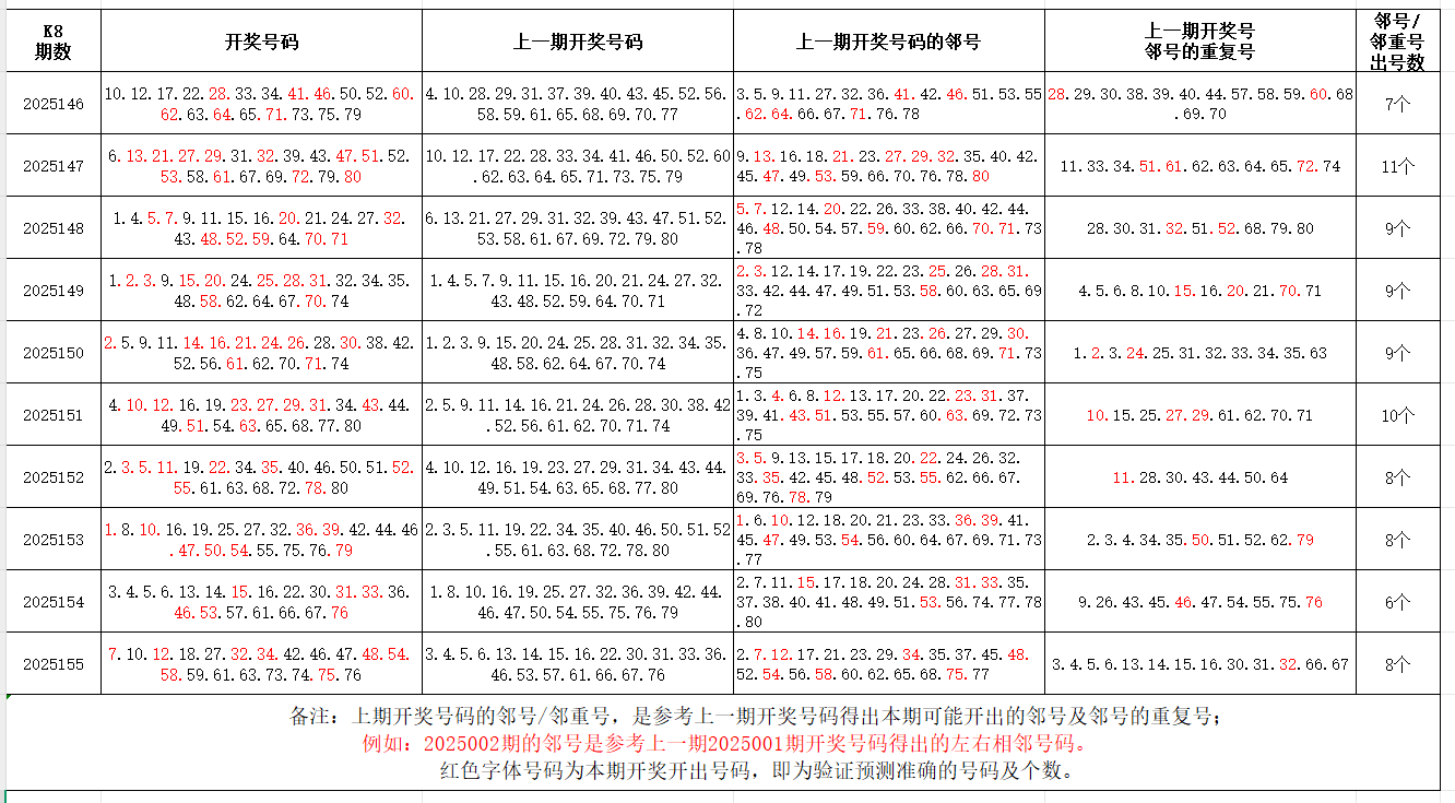 如图,红色字体是上期邻号、邻重号在下期开出,每期开出10个左右。上期邻号开出7个,邻重号开出1个。本期参考邻号:6.8.9.13.17.19.26.28.31.35.41.43.45.49.53.55.57.64.72.77;邻重号:11.33.46.47.48.60.62.73.74.75.76;个人分析,仅供参考。