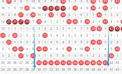 上图是福彩快乐8开奖号码走势分布图其中一部分,我在上面走势图中标注出来的数字一共有12个,这12个数字上期是一个数字都没出现,那么这个区域的数字开出的机会是有的,关注这个区域的数字出3个或者4个,个人最看好数字3435 3536 3738。