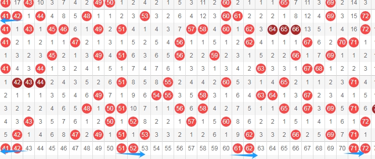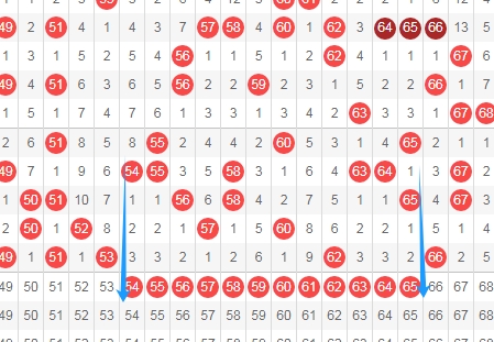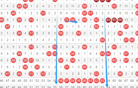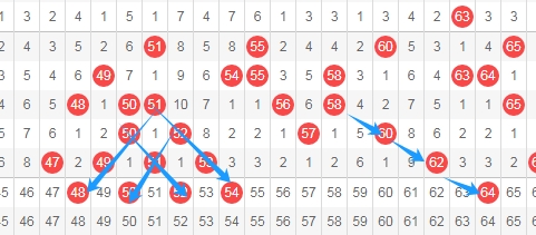上图是福彩快乐8开奖号码走势分布图其中一部分,我在上面走势图中标注出来的数字48 50 52 54都是斜连号码,数字48一直从数字51斜连下来,数字50一直从数字52斜连下来,数字52一直从数字50斜连下来,数字54一直从数字51斜连下来。数字64是跨度二斜连,从数字58一直斜连下来。