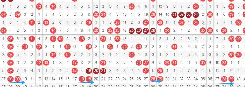 上图是福彩快乐8开奖号码走势分布图其中一部分,我在上面走势图中标注出来的数字是8尾数数字和9尾数组成的连号组合,分别是0809 1819 2829 3839一共有4组,这4组连号组合最近十几期都没出现过,那么本期可以留意这些连号组合出现,个人最看好1819 3839。