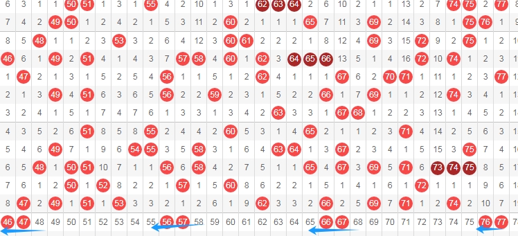 上图是福彩快乐8开奖号码走势分布图其中一部分,我在上面走势图中标注出来的数字是6尾数数字和7尾数组成的连号组合,分别是4647 5657 6667 7677一共有4组,这4组连号组合最近十几期都没出现过,那么本期可以留意这些连号组合出现,个人最看好7677 5657。