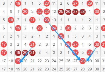 上图是福彩快乐8开奖号码走势分布图其中一部分,我在上面走势图中标注出来的数字19 28都是斜连号码,数字19一直从数字21斜连下来,数字28一直从数字22斜连下来。