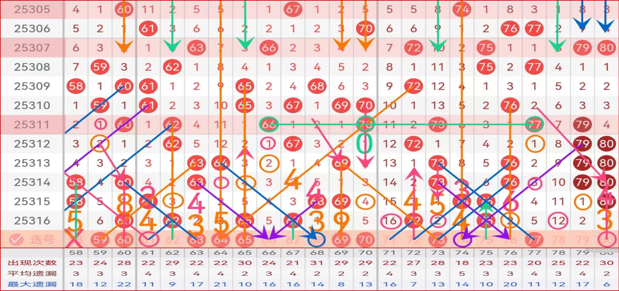 四区间给到主做号码球:63 64 65 69 70 73 77防守号码球:78 80;