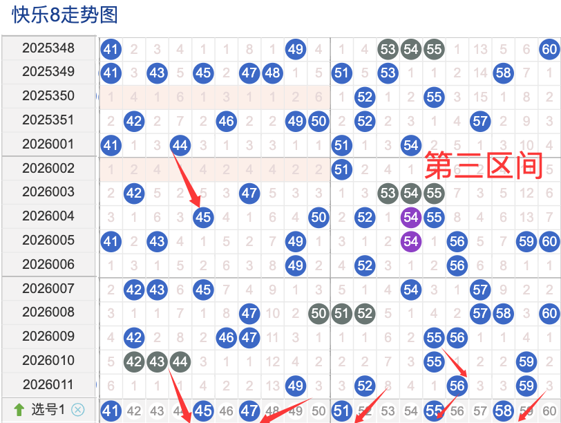 三区间开出了4个奖号(49.52.56.59)上期回顾三区开出4个奖号上期的三区间的奖号数量呈现一个递减的形态,4头回补1个号码,本期先来看号码41近期出现频率相对来说还是很稳定。偶尔有时间隔期数也是很长,说明其在近期的开奖中较热的,号码45在近 30 期内出现次数相对是稳定的号码,近期的活跃度也是较热。号码51有一定的间歇性,通常间隔5-4期会出现一次,没有明显的连续出现态势,走势相对较温热,在整个第三区间的表现本期还是可以防守的。号码58走势相对近期较温热,近期没有连续间隔落号的情况,活跃度近期处于较温热状态注意防守。