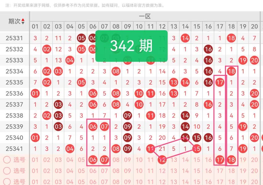 一区在上期开出6码,热度较高,本期大概率回归常态出号量。06和07属于长期热号,近30期出现次数多次,近百期出现频率较高,稳定性强,符合热号持续活跃的统计特征。12在近3期走势中频次平稳,属于中温号范畴,其尾数与上期开出的11、15形成互补,能平衡尾数分布。17和18是典型的中温号,近30期出现多次,近百期出现频率较高,这类号码出现概率均衡,且与上期一区开出的04、08等号码在跨度上形成合理间隔,避免号码过度集中。