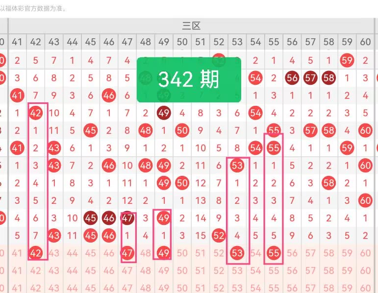 三区上期开出4码,低于近10期平均出号水平,本期有望热度回升。42与上期开出的43、45形成相邻呼应,历史数据中同区域相邻号码组合出现频率较高,且其属于中温号,稳定性与活性兼具。47和49是近3期走势中逐渐升温的号码,从冷热转换规律来看,这类号码后续出现概率提升。53和55均为长期热号,近30期出现次数多次,且二者在区域内分布均匀,能带动三区整体出号热度。