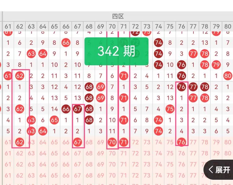 四区上期仅开3码,是上期出号最少的区域,本期大概率补位升温。62与上期开出的63、64形成连号延续,符合历史数据中连号集群的分布特征,且其属于中温号,出现概率均衡。67和70属于边缘冷号向温号转换的类型,70近30期出现1次,具备冷号回补潜力,能丰富区域内号码类型。71是长期热号,近30期出现次数多次,近百期频率较高,稳定性强;76作为中温号,与71形成合理跨度,平衡四区整体出号节奏,契合区域出号回归均衡的规律。