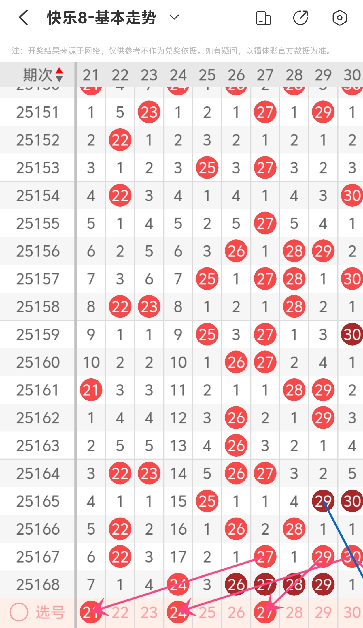 上期第三区间开出24 26 27 28 29,本期我们可以从上面走势图中看到选号的思路,本期推荐21 24 27