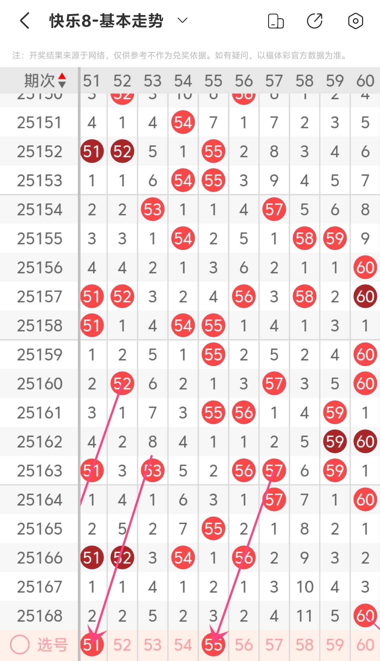 上期第六区间开出60,本期我们可以从上面走势图中看到选号的思路,本期推荐51 55