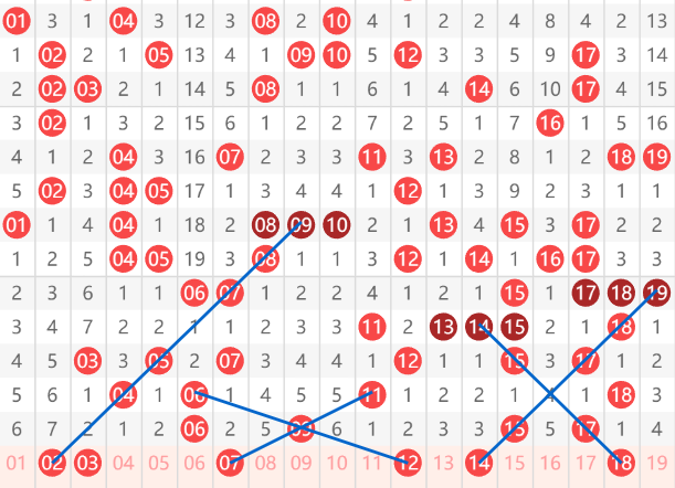 快乐8第103期01-20区域,推荐的第一个号码是02,大家可以看到它有一个09.08.07,三连间隔一期给个05.04,再间隔一期给个02的走势,然后就是03,可以看到和04之间一个经典的三角夹角走势。再往后就是07和12这两个号码,07是间隔一的斜连,12是间隔2的斜连。然后就是14号,大家看到他从19.18.17间隔一开15再带14的走过来的一个斜连走势,以及18号从14、15间隔一给17带18的走势。