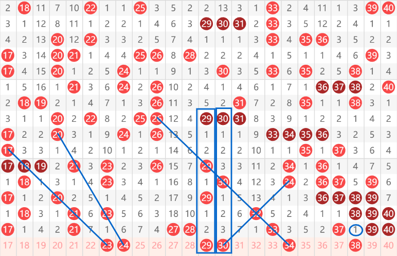 快乐8第103期20~40区域,推荐的第一个号码是23号,大家可以看到17-18间隔一给20,然后给出21,再间隔一给23的一个走势,同时23又是一个经典的两重间隔一带一的走势,然后往后就是29号的上下对称,可以看到29间隔2间隔一间隔2的对称走势,以及30的间隔3对称走势。然后就是34,大家看到从26过来的一个走势,是一个1-2-3的走势,最后就是38这个空格可以看到37上下间隔一,那么38有可能走同样的走势。