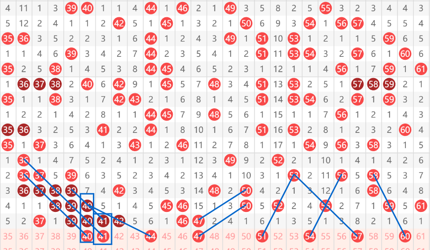 快乐8第103期41-60区域:推荐的第一个号码是40和41,这个地方比较热,基本上都是以对子的形式出现了,两个36,两个37,一直延伸到两个40和41.下来就是44号一个斜连走势40间隔一出42再间隔一出44的走势。然后47号我们可以看到50间隔一下47的走势,再往后就是53间隔一出52再隔一出51的斜连,53间隔一出55再间隔一出57的斜连,56间隔一出55再间隔一出54的斜连,还有58间隔一出59再间隔一出60的间隔一斜连。