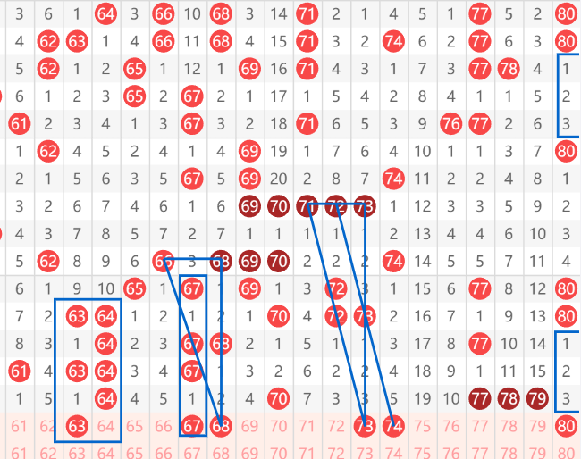 快乐8第103期61-80区域:最后一个区域,第一个号码是63号,他是一个经典的间隔一的走势,是目前比较热的走势。然后就是67和68这两个走势,67是一个间隔对称走势,而68是一个倒三角形的走势。然后再往后就是73和74这两个号码.是一个两连的间隔对称走势,同时73又是一个倒三角形的走势,最后就是80间隔3对称走势。