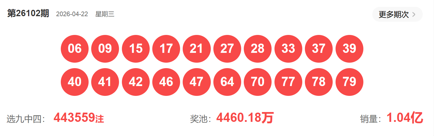 快乐8第102期开奖如下