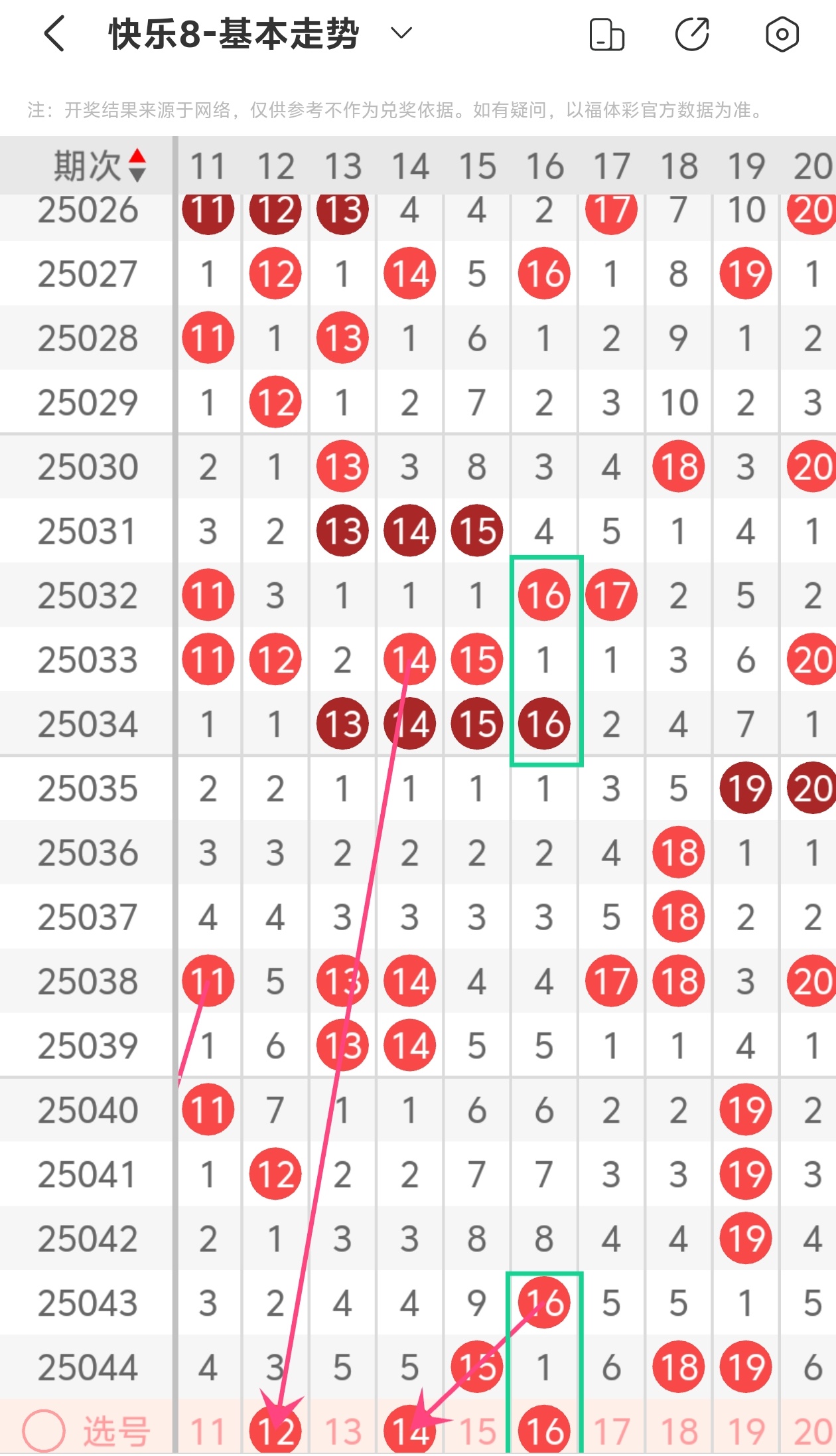 上期第二区间开出15 18 19,今天推荐12 14 16,从走势图上可以看出我的分析。