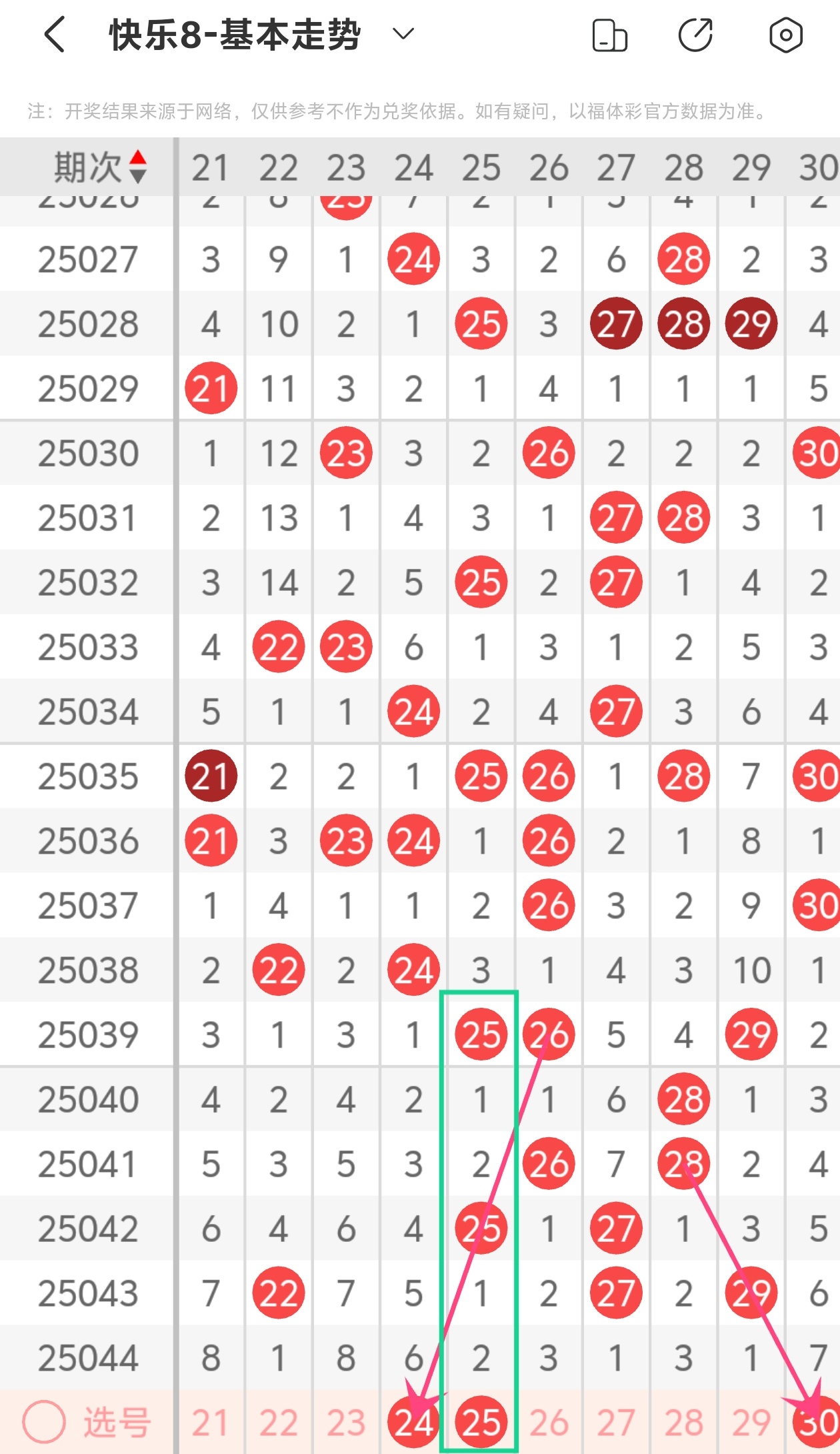 上期第三区间走空,本期我们可以从上面走势图中看到选号的思路,本期推荐24 25 30