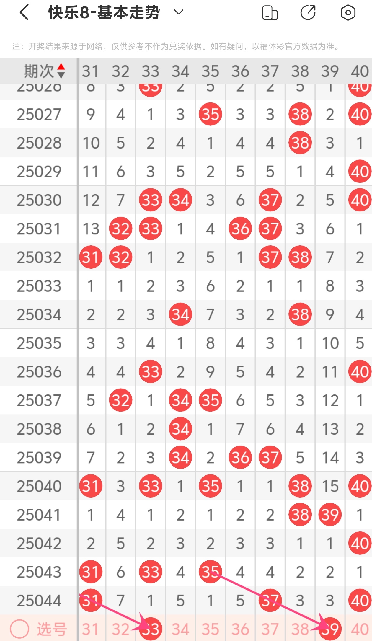 上期第四区间开出31 37 40,本期我们可以从上面走势图中看到选号的思路,本期推荐33 39