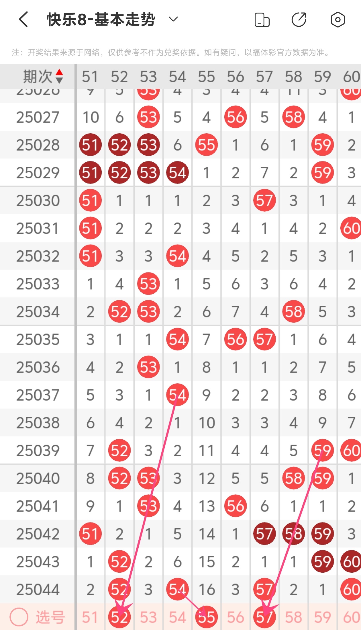 上期第六区间开出52 54 57 60,本期我们可以从上面走势图中看到选号的思路,本期推荐52 55 57