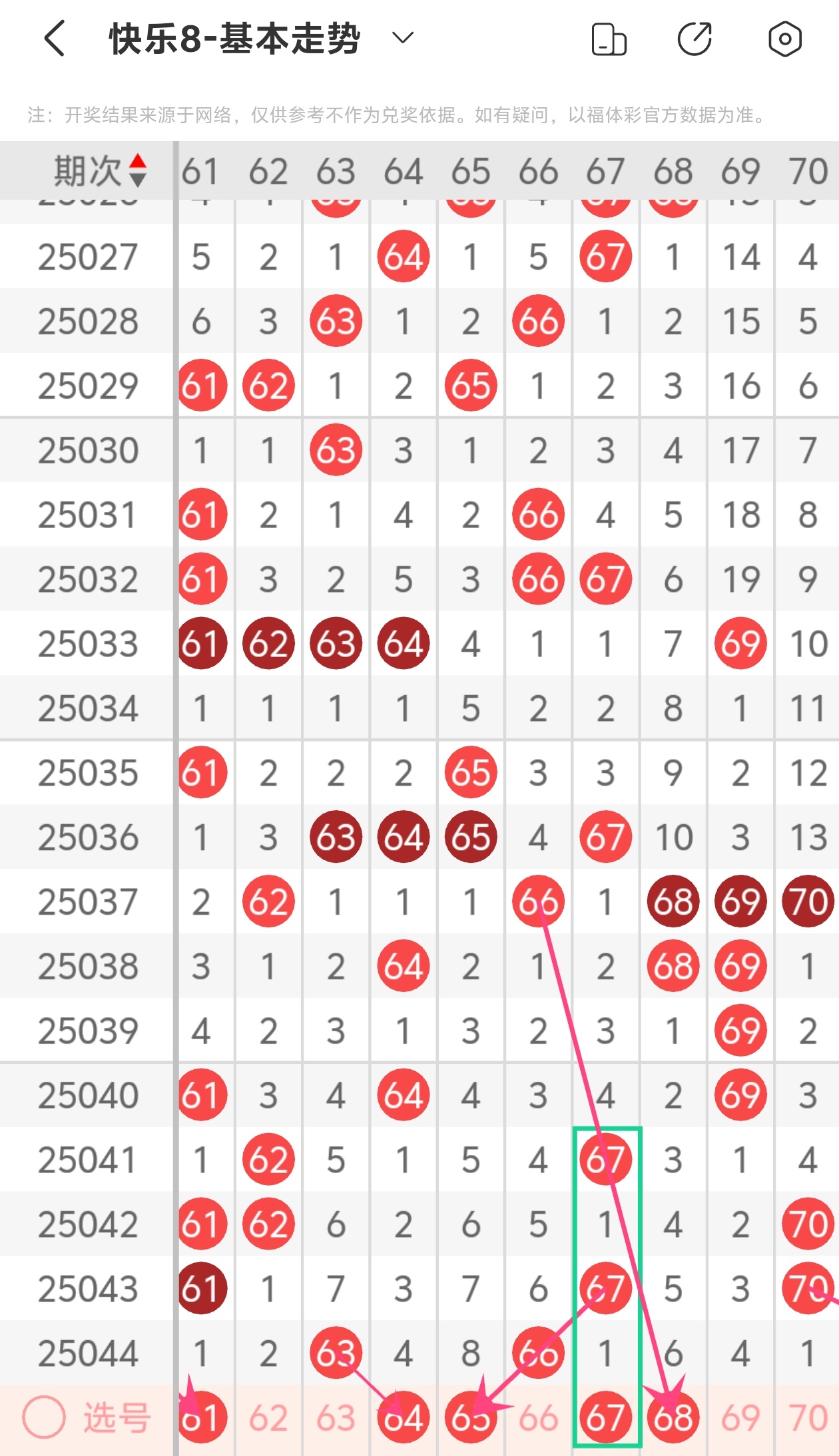 上期第七区间开出63 66,本期我们可以从上面走势图中看到选号的思路,本期推荐61 64 65 67 68