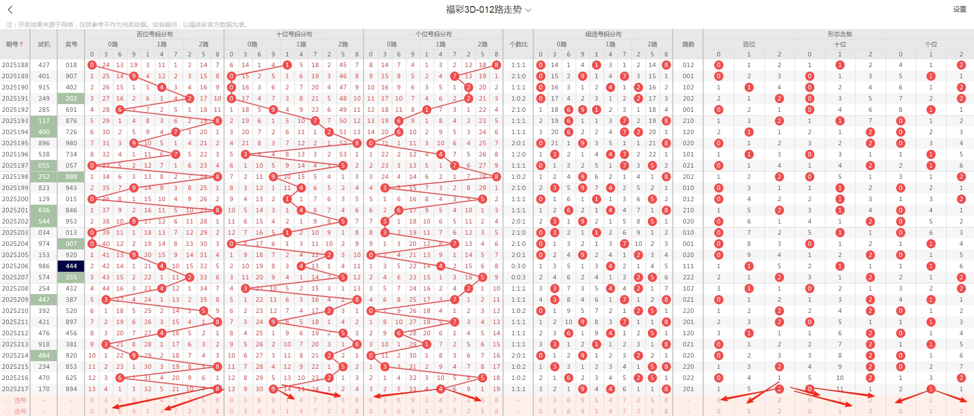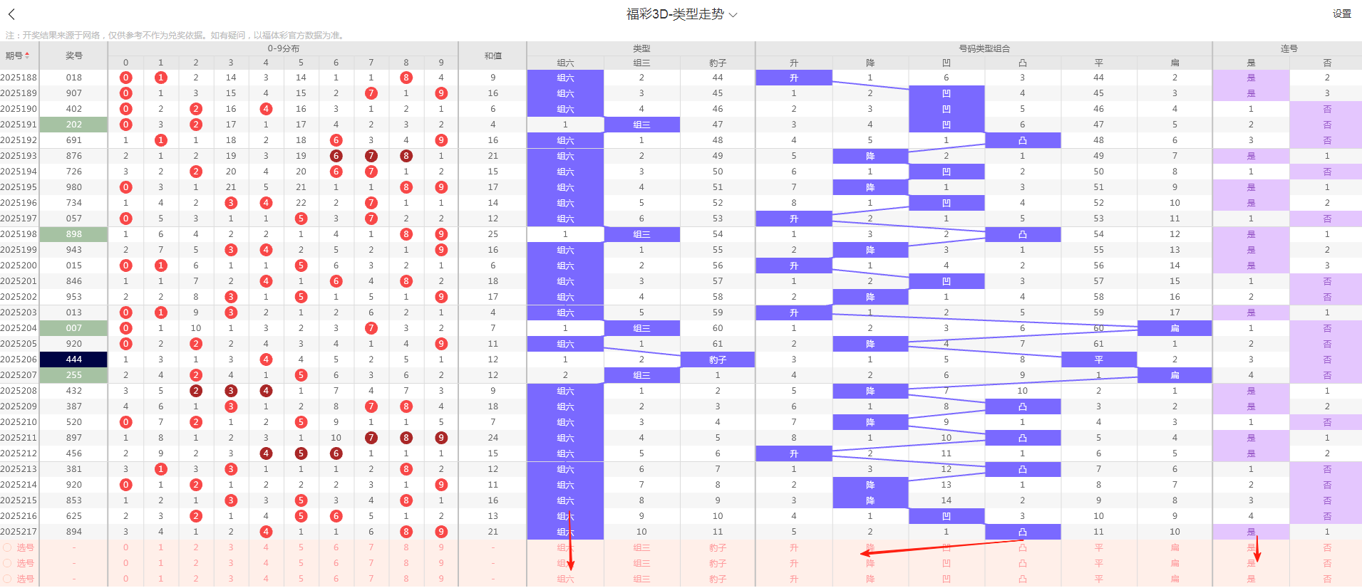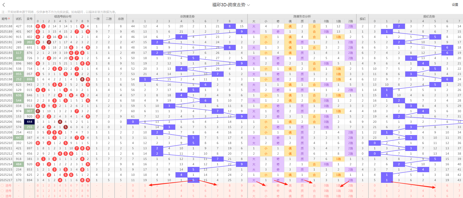 今天福彩3D第2025218期的趋势判断为:方向主看组六防组三;跨度反弹大跨度明显;和值回落中区概率较大;