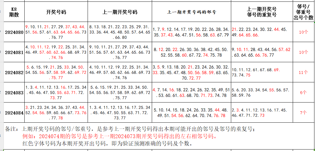 如图,红色字体为上期的邻号、邻重号在下期重复开出,每期开出10个左右。本期推荐邻号:2.4.20.25.33.38.42.45.51.57.58.61.65.68.72.74.75.79;邻重号:22.23.24.36.37.43.44.59.60.66.67.76.77.78;推荐邻重号定胆:22.35.53.55.