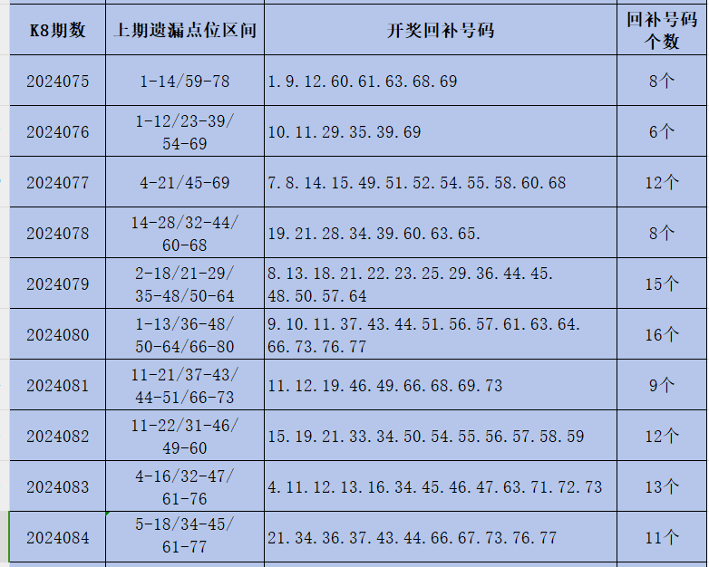 如图,上期的遗漏号码大概率会在下期开出10个左右,即为回补号码。回补号码结合八分区的冷热走势,定位本期回补点位区间。本期推荐点位区间:2-19/25-35/43-58/65-78。个人分析,仅供参考。