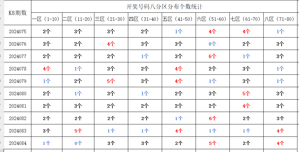如图,红色字体为热号区,开出4个及以上号码;蓝色字体为冷号区,开出1个及以下号码。以近10期为一个分析周期,依据久热必冷,久冷必热的规律,本期推测:一区、二区可能回暖,开出1-2个号码。三、四、五区保持温热,开出2-3个号码。六、七、八区热度降低,开出2-3个号码。个人分析,仅供参考。