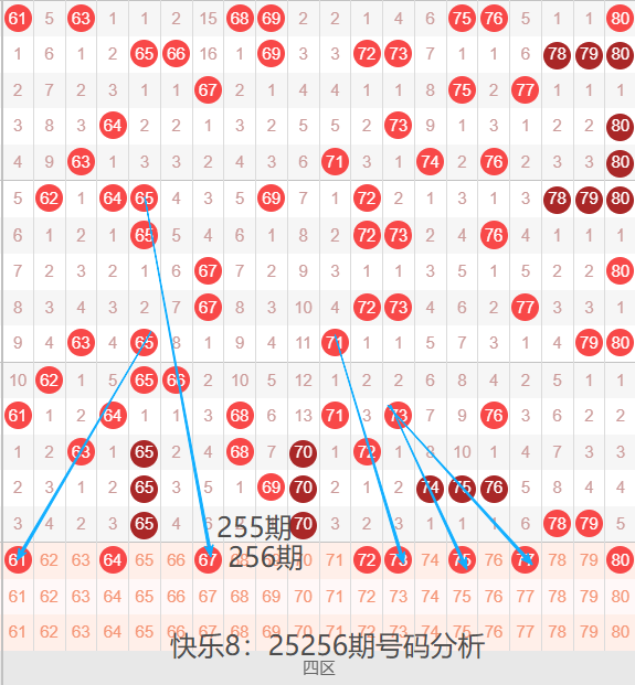 回顾25255期开奖号码:05 13 15 21 25 26 27 31 37 39 46 50 54 56 57 59 65 70 78 79 ,最近一段时间号码爆区几率特别高,目前已经连续多次出现爆区热开的情况,爆区之后基本上都是迅速回调,转换至其他区间继续暴热,大家若是能抓准区间,或许有很大的机会,但是号码的变盘规律是非常的快,很难把握,个人建议谨慎选择,不要 盲目的去操作~~