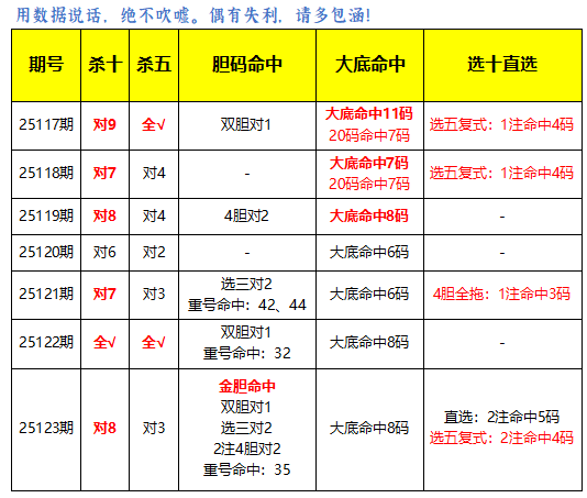 上期杀10码对8,杀5码对4,双胆命中,三胆对2,2注4胆中2,重号命中35,大底命中6码,本期再接再厉!