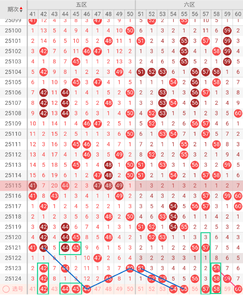 五区开出:42,48 奇偶比: 0:2 和值:90 跨度:6,上期开出2个号码,偶数号码占优势,重号:42,重号数:1。本期无三斜连走势,隔码斜连走势:46。近5期出号量:4-4-1-3-2,近10期平均出号2枚,上期奇偶比:0:3,本期推荐关注号码:42、44、45、46。