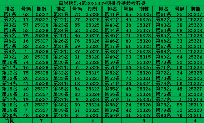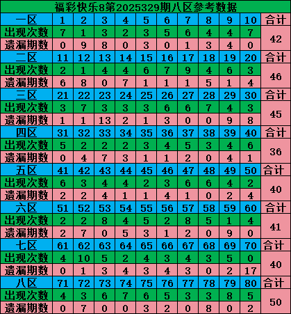 最后再把号码分为四区:一区01-20号、二区21-40号、三区41-60号、四区61-80号,理论上每个区每期应该开出5个号码: