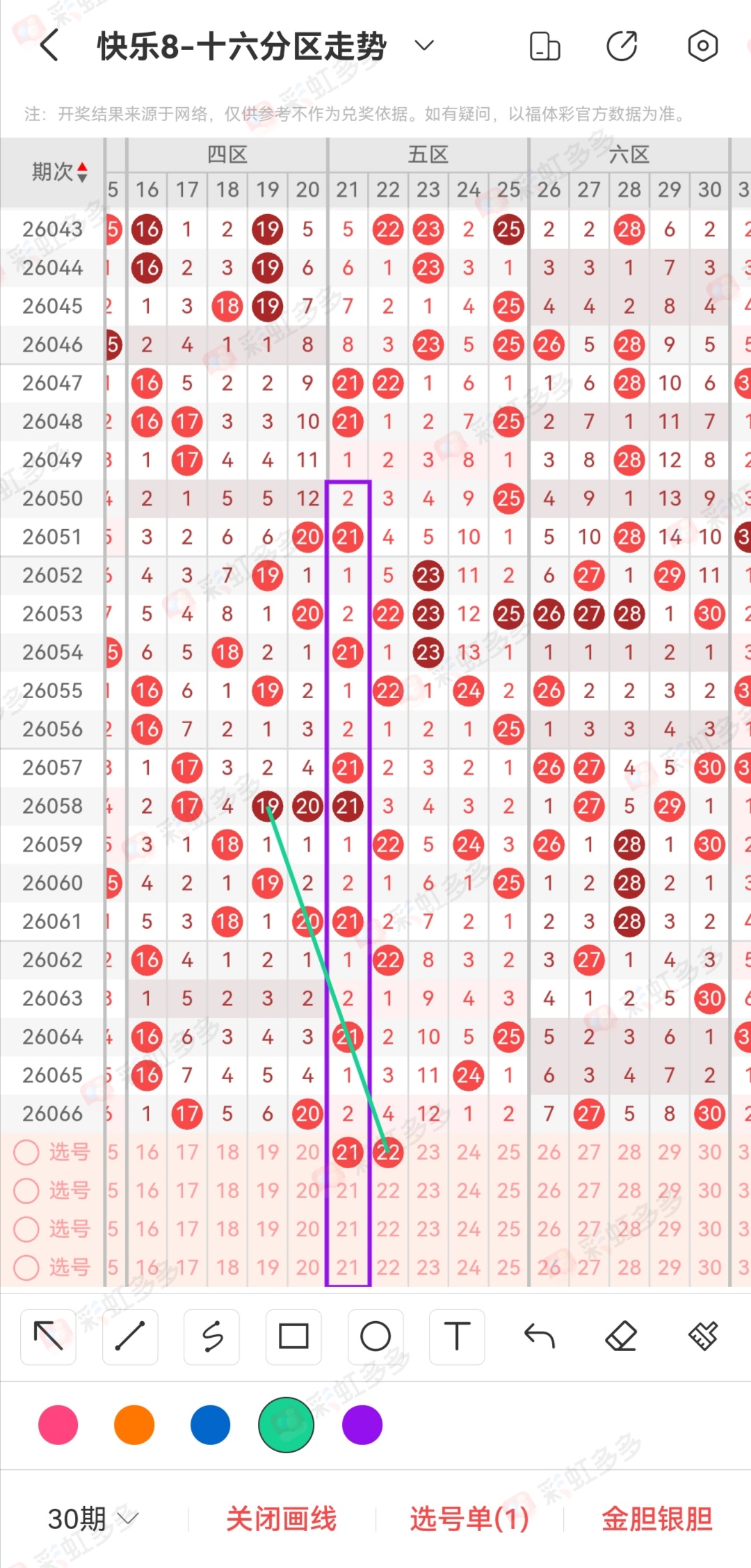 第二张图讲解的是昨天的04 54逻辑。我和大家说过,近期的10期遗漏满足一个特点,当期存在10期遗漏同出,那么就会存在同尾0头。比方说最开始的77同出07,然后59同出09,11同出01,昨天的10期遗漏同出04,只不过54 64存在2码10期遗漏,所以昨天的公推,以04定位,拖码考虑54 64很棒。昨天打的选六单挑,有连带54,因为判断不了,最主要的还是想搏一下大奖。然后我们通过这么5期数据做一下对比,恰巧今天没有存在10期遗漏,0头今天能不能稳定空区。大家注意下。