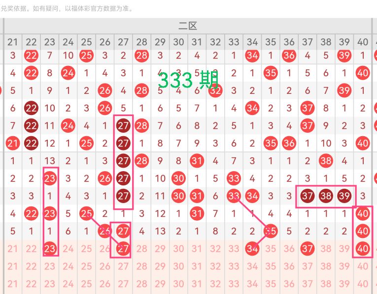 23号:遗漏1期,近期21-30段连号频发(26-27),形成热区带动效应,历史上该区间冷码在连号出现后回补概率较高。27号:近30期出现11次的热号”,连续5期开出后,332期再度亮相,热度碾压同期号码,结合21-40区间“热号主导”的走势,大概率继续开出。34号:332期开出35、330期开出31,34号恰处斜连中间位,且该区间近三期31-40段出号递增,有望在333期完成走势闭环。37号:遗漏8期,328期、330期曾在37-39段形成连号,近期该区间冷码积压明显,历史上遗漏8-10期的号码回补率较高。40号:332期刚开出的热号,近30期40号出现10次,且21-40区间近两期收尾号均为40、38,形成“收尾热”趋势。