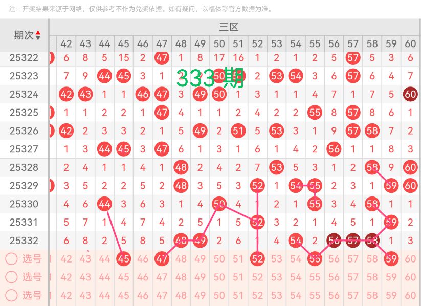 47号:斜连走势,332期开出48、49,329期开出41号形成完美斜连轨迹,且41-50段近三期出号稳定在2-3枚,历史斜连号回补概率较高。52号:遗漏1期的温号,41-60区间近三期连号密集(48-49、56-58),热区带动冷码解冻的历史概率极高。55号:近期开出的热号,目前已经遗漏2期,近30期出现12次,属于区间热号,51-60段近三期出号递减,需要热号支撑。59号:332期开出56-57-58三连号,历史上三连号后紧邻号码回补概率较高,且59号遗漏1期,处于温码向热码转化阶段。45号:遗漏5期的温码,平衡区间走势的关键,41-60区间近三期41-50段出号偏多,45号恰处空白位,历史上该区间温码补位概率较高。