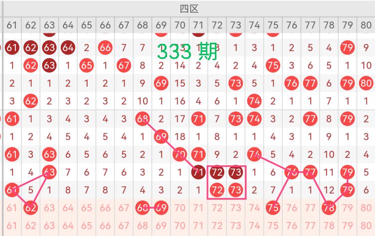 62号:近20期出现13次的热号,遗漏5期后强势回归,61-70段近三期出号偏少,需要热号带动,历史上该号码遗漏5-6期后回补概率较高。68号:遗漏5期的冷码,迎来最佳解冻时机,61-80区间近三期72-79段出号密集,61-70段冷码积压,历史上区间冷热转换时冷码回补率较高。78号:79号的邻号且遗漏12期,332期开出79,历史上78-79连号出现概率较高,且71-80段近三期出号递增,78号遗漏12期,处于回补窗口期。75号:近30期出现9次的温码,走势平稳,61-80区间近三期出号均衡,71-80段需要温码填补空白,历史上该号码在均衡走势中回补较高。69号:61-70段的补位,该区间近三期61、63均已开出,69号遗漏3期,处于冷码回暖阶段。