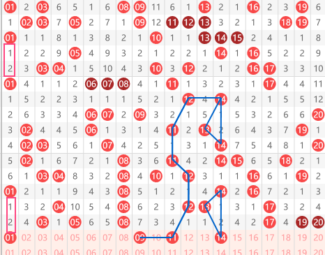 快乐8第2026059期01-20区域,推荐的第一个码是01,大家可以看到它是一个上下间隔对称的走势,上面间隔2,中间间隔6,然后下面间隔2,下来是09和11,我们看到12和11是一个 s 型的走势,上面是一个12,间隔一期给个11,再间隔一期给个11,然后紧挨着给个12,下面刚好相反。然后上面是12和14,那么下面就是09和11形成一个对称。同时14号大家看到了上下间隔是对称的,上面是14,向上开出13,间隔一给出14,那么向下开出13,间隔一起给出14。所以推荐这4个号码为一区的重点号码。