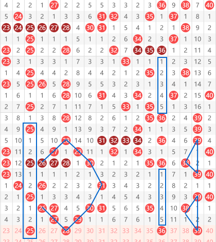 快乐8第2026059期20~40区域,推荐的第一个号码是25号,大家看到它是一个间隔2的连贯走势,以及它和26之间有个经典的三脚夹角走势。然后就是28号,我们可以看到从31往上给出了30.29.28,那么往下很有可能给出同样的走势,以及旁边的那个大连继续延伸下来,还有就是27.29 31,间隔一斜连,然后就是36号间隔5的对称走势比较完美。39号我们看到它在这个地方也是个完美的对称走势,上面39-38-39,下面是39-38-39,形成一个完美的对称走势。