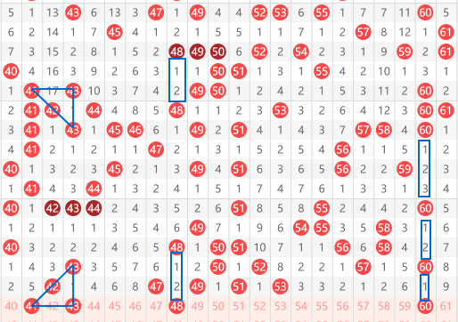 快乐8第2026059期41-60区域:推荐的第一个推荐的号码是 43,大家看到他们两个上下有一个完整的三角对称,上面是43,斜着出41、42,然后横着43,下面的走势完全相同,而且43本身又是一个间隔,3-2-1的间隔递减走势;下来就是48的上下对称走势。间隔2,然后间隔6,然后再间隔2,最后就是60,这个号码是一个间隔3,间隔2,然后再间隔一的间隔递减走势。